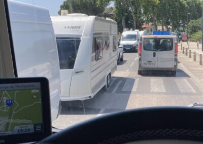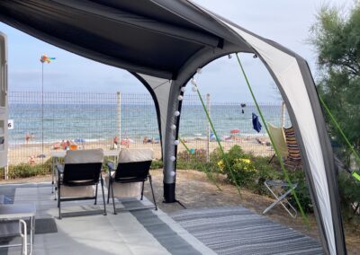 Schon beim Aufwachen pfeift der Wind ums Wohnmobil. Er frischt im Verlauf des Tages bis auf 5–6 Beaufort auf. Unser Sonnensegel hält tapfer durch – anders als einige Markisen in der Umgebung, die eingefahren werden müssen.