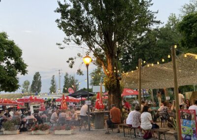 Zum Abendessen gibt es gegrilltes Steak mit Curryreis, Erbsen und Rüebli – dazu ein Glas Rosé. Um 21:45 Uhr ziehen wir noch einmal los ins Campingrestaurant – auf ein eisgekühltes Bier und eine Sangria.