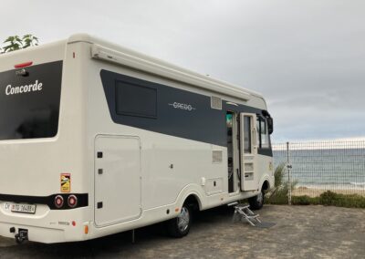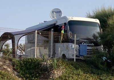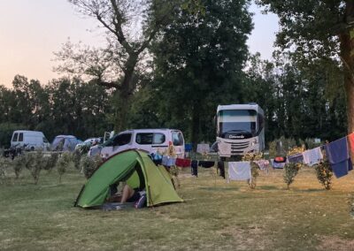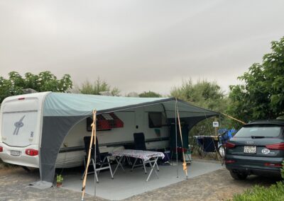 Um 15:30 Uhr checken wir auf Platz 96 ein. Strom anschliessen, Womo ausnivellieren, Sonnensegel, Teppich, Tisch, Stühle – alles sitzt.