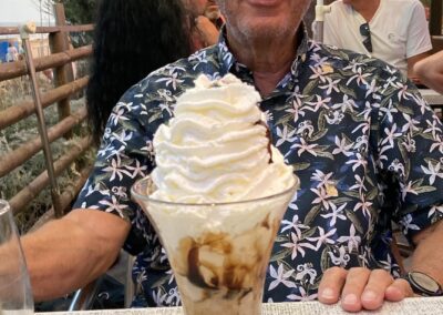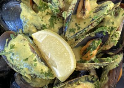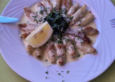 Am Abend haben wir im Campingrestaurant für 20:00 Uhr reserviert. Christine geniesst ein feines Thon-Tartar, Jürg Muscheln in köstlicher Knoblauchsauce – dazu ein halber Liter Rosé.