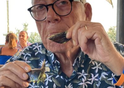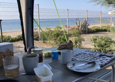 Wir machen’s wie unsere Nachbarn und gehen vor dem Frühstück baden. Danach gibt’s ein ausgiebiges Frühstück – und schon zieht es uns wieder an den Strand.