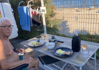 Zum Abendessen gibt’s Pouletflügeli, Chorizo und Salat. Danach kommen unsere netten Schweizer Campingnachbarn, Andrea und Andreas, noch auf ein Glas Rosé vorbei.