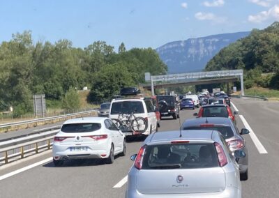 Nach den letzten Vorbereitungen starten wir um 11:00 Uhr Richtung Genf. Die Autobahn ist trotz wenig Lastwagen gut befahren, und es fühlt sich an, als würde man durch eine endlose Baustellenlandschaft fahren. Trotzdem kommen wir zügig voran und lassen den geplanten Zwischenstopp in Neydens (F) aus.