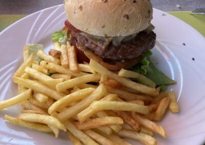 Abends essen wir im Campingrestaurant: Burger, Filets de Perche und als Dessert einen Colonel. Danach gehen wir früh schlafen.