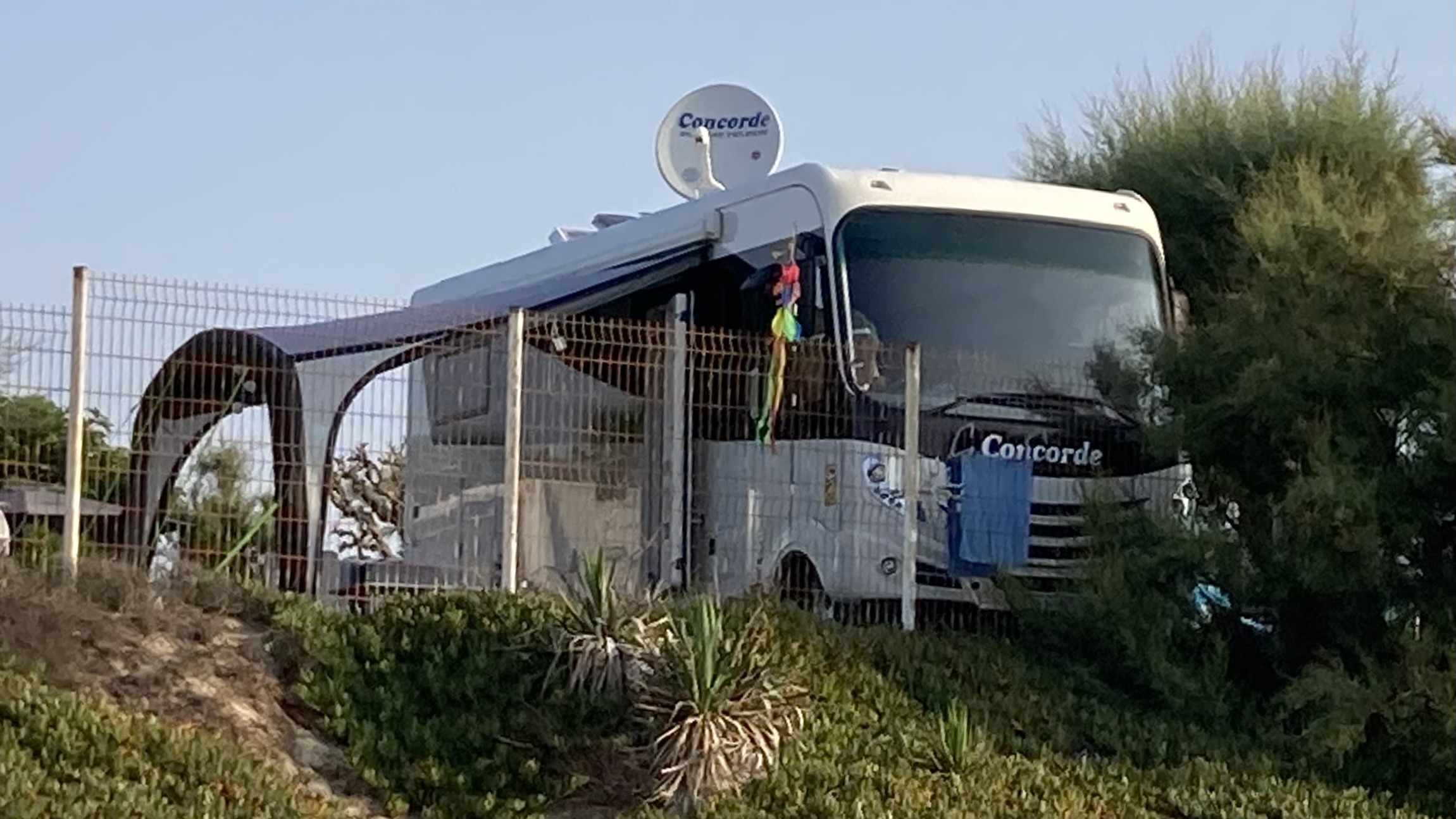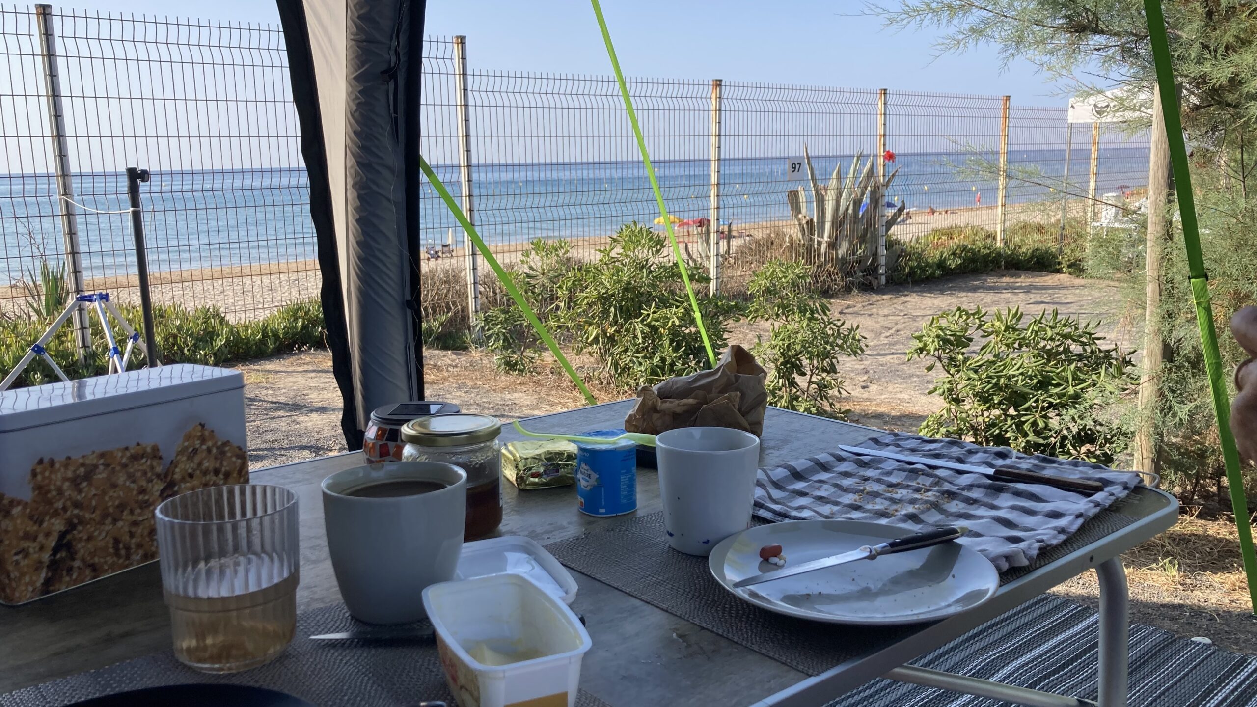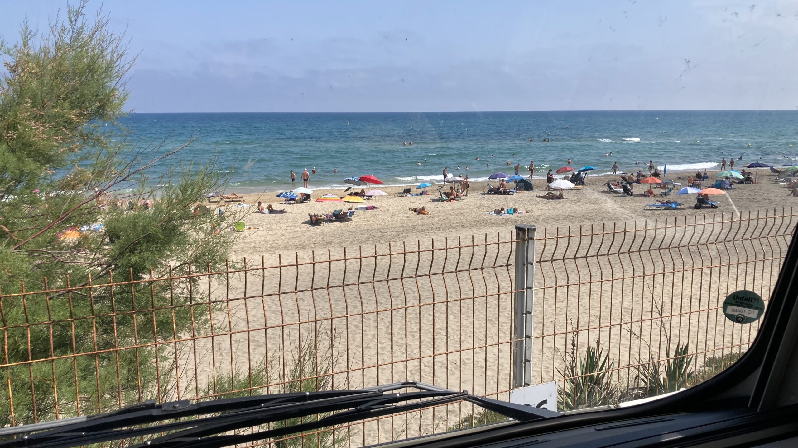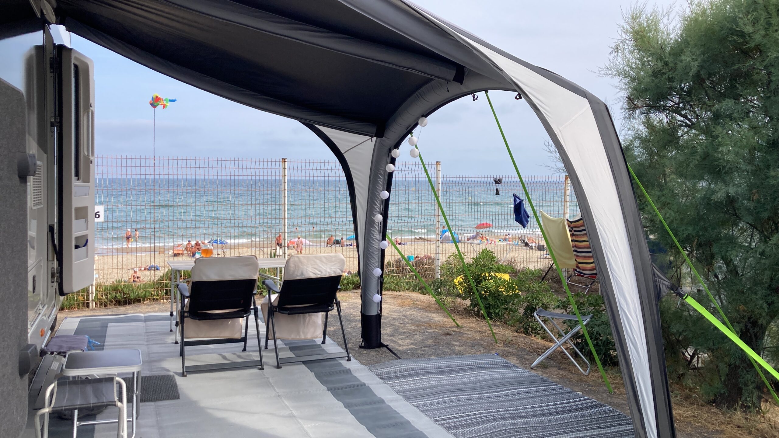 Schon beim Aufwachen pfeift der Wind ums Wohnmobil. Er frischt im Verlauf des Tages bis auf 5–6 Beaufort auf. Unser Sonnensegel hält tapfer durch – anders als einige Markisen in der Umgebung, die eingefahren werden müssen.
