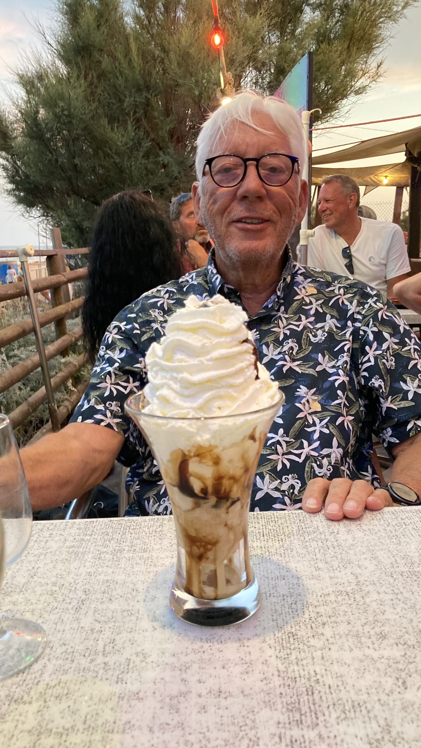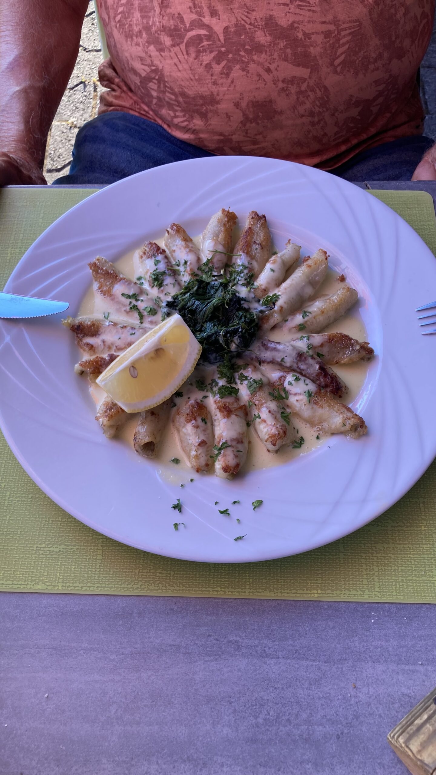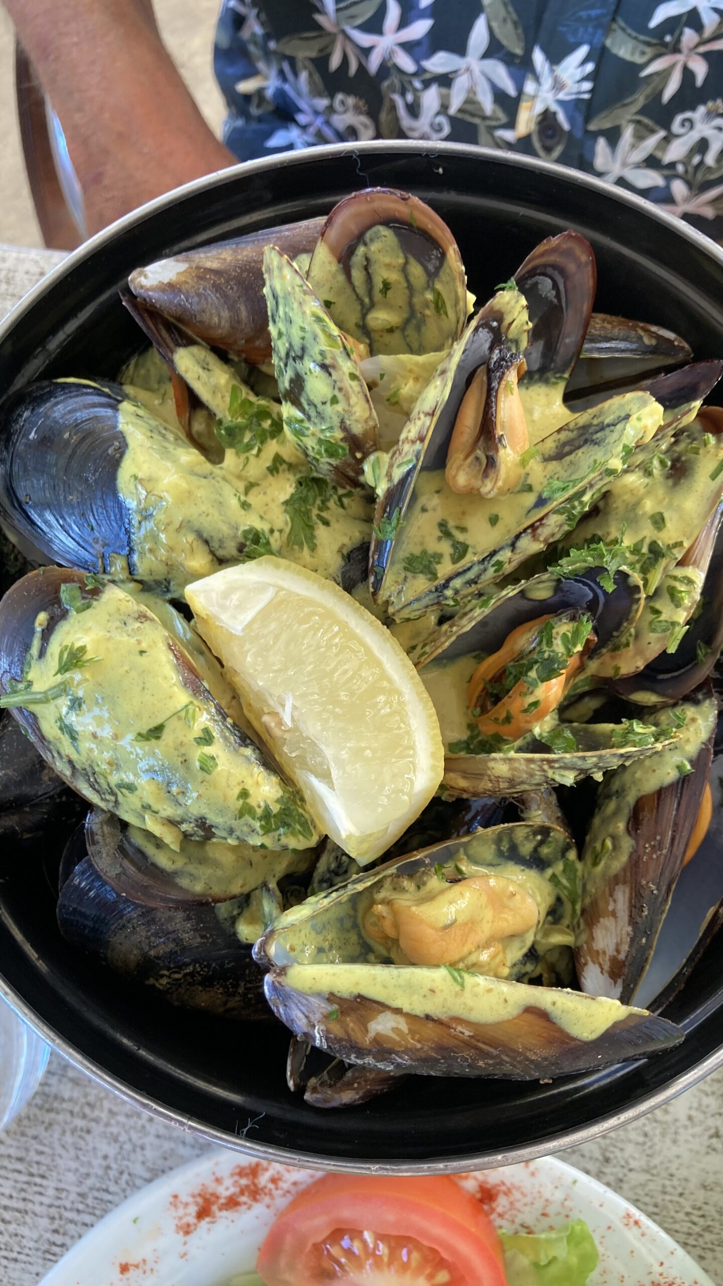 Am Abend haben wir im Campingrestaurant für 20:00 Uhr reserviert. Christine geniesst ein feines Thon-Tartar, Jürg Muscheln in köstlicher Knoblauchsauce – dazu ein halber Liter Rosé.