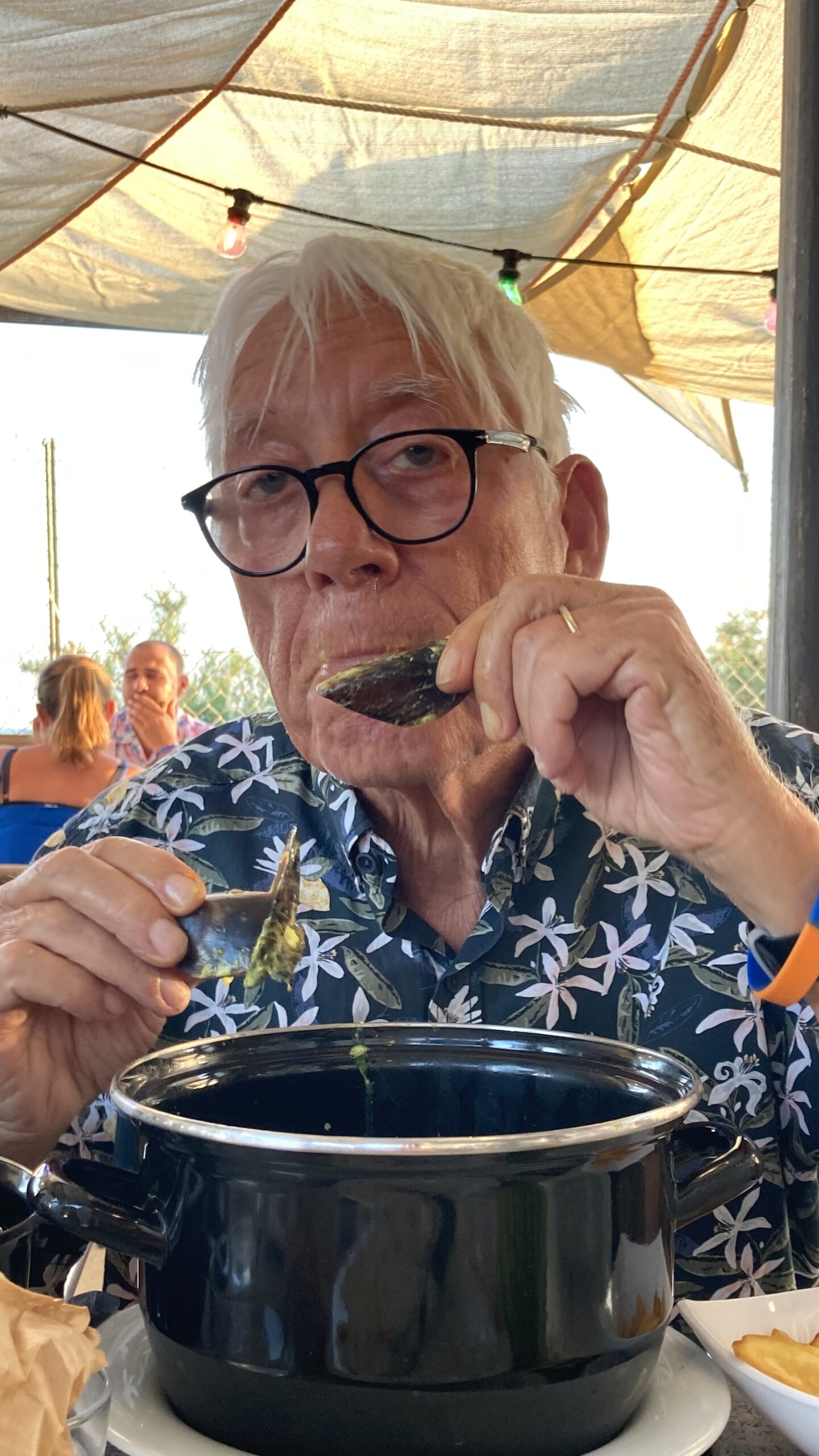 Um 20:00 Abendessen im Campingrestaurant: Für Pulpo und Muscheln mit Curry warten wir über eine Stunde – das Warten lohnt sich.