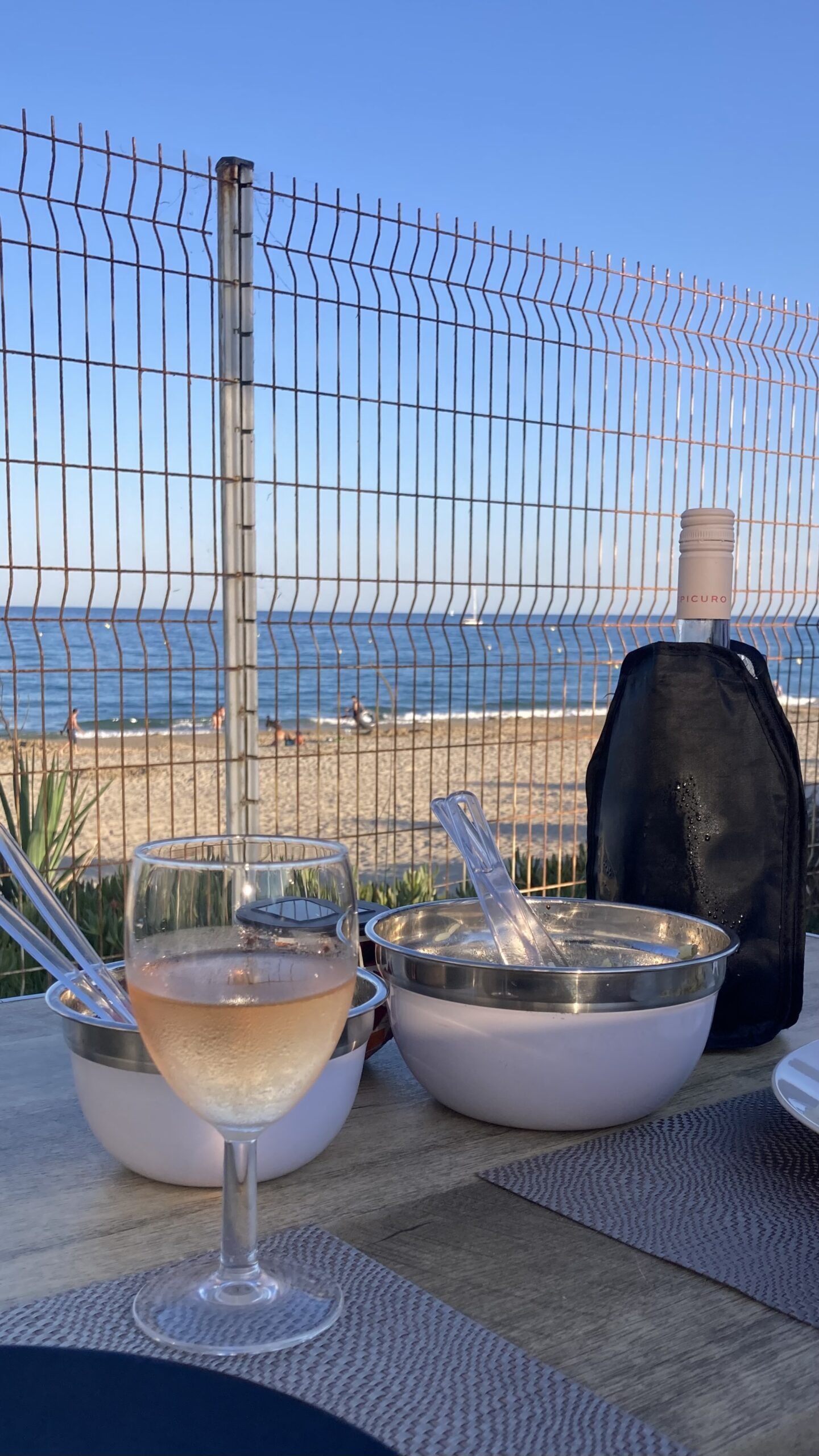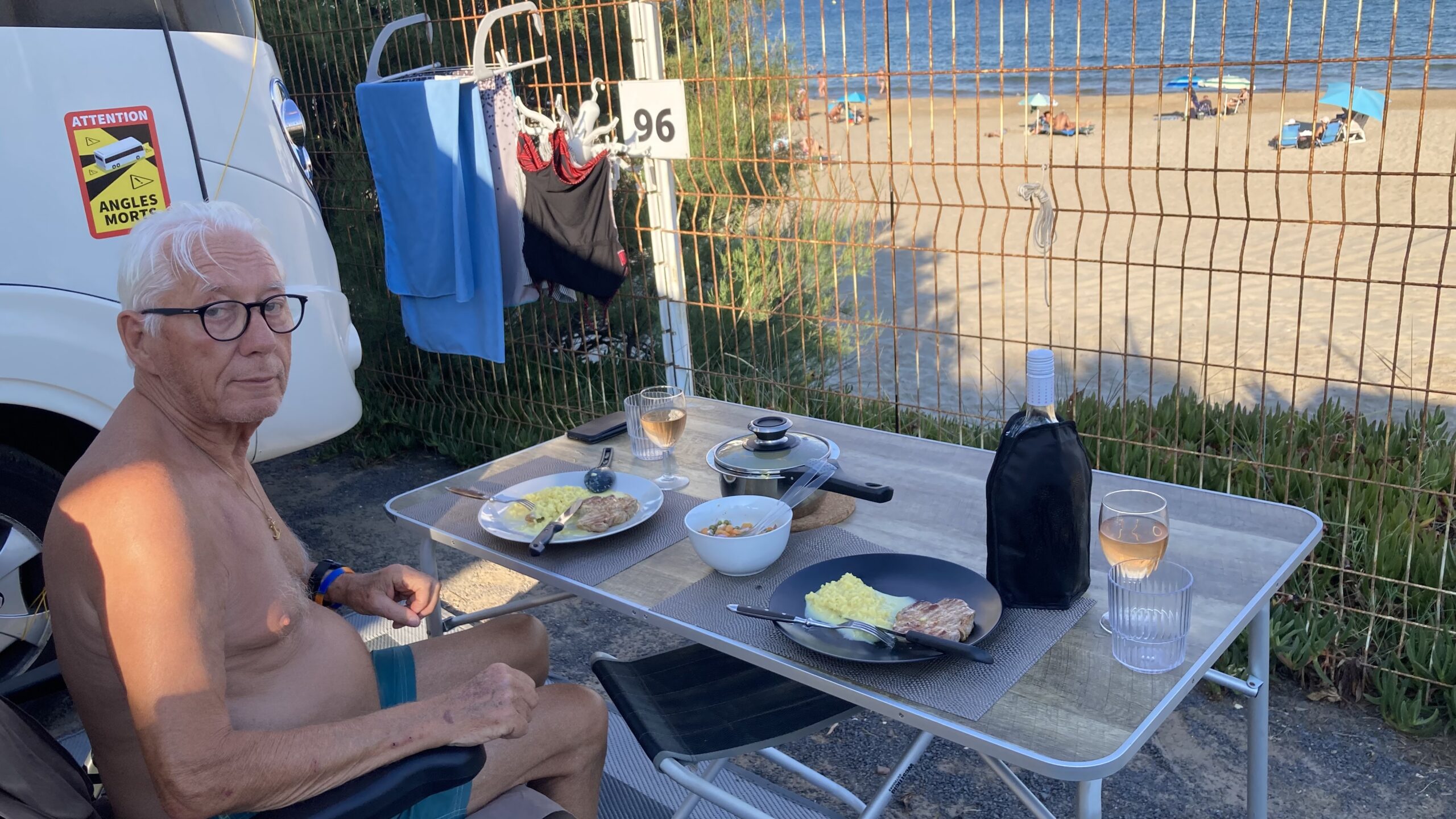 Zum Abendessen gibt es gegrilltes Steak mit Curryreis, Erbsen und Rüebli – dazu ein Glas Rosé. Um 21:45 Uhr ziehen wir noch einmal los ins Campingrestaurant – auf ein eisgekühltes Bier und eine Sangria.