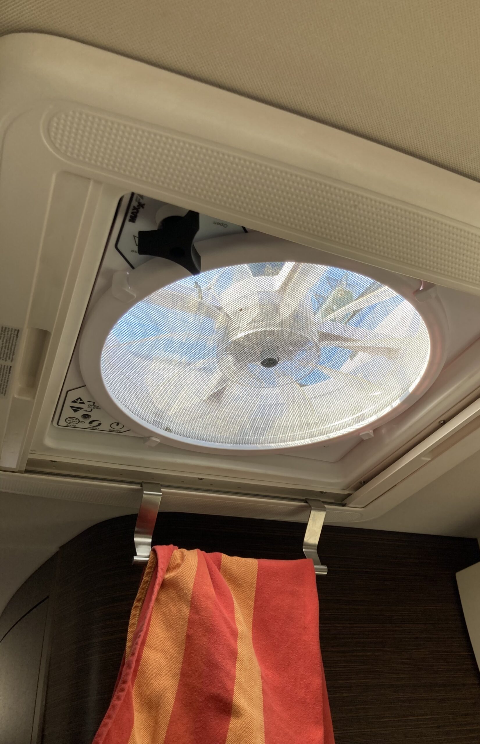 Zum Schlafen bleibt heute die Luke geschlossen. In der Küche läuft der Maxxfan auf 30 % – gerade angenehm für etwas Luftbewegung.
