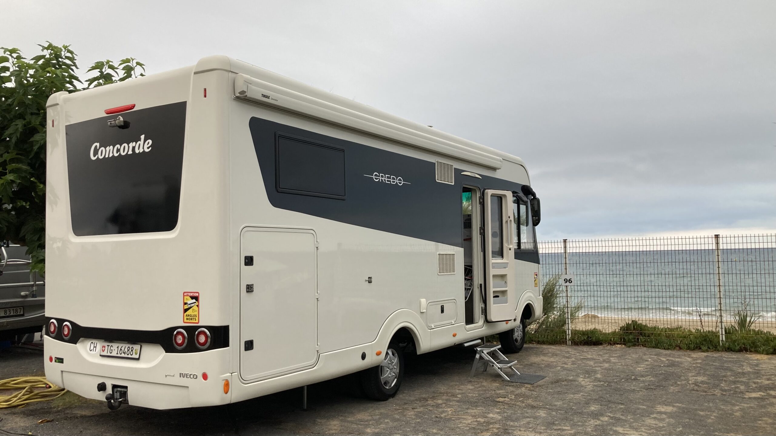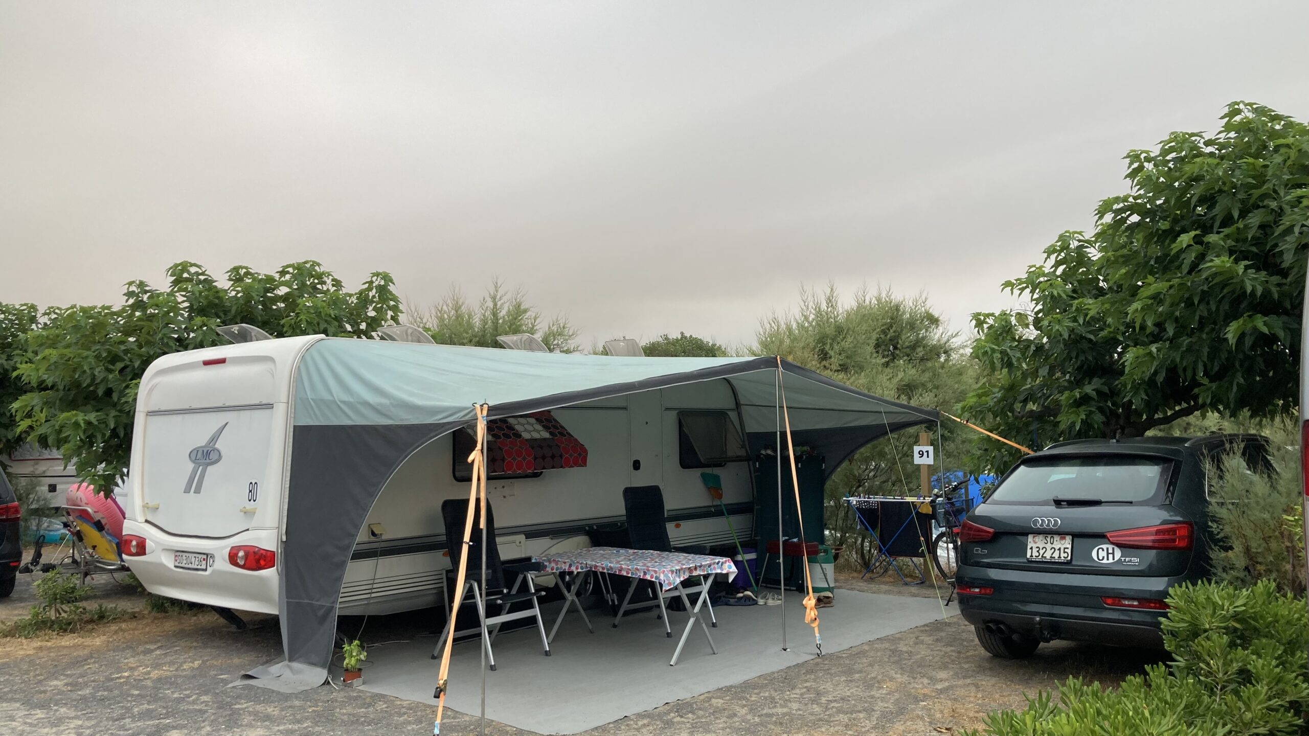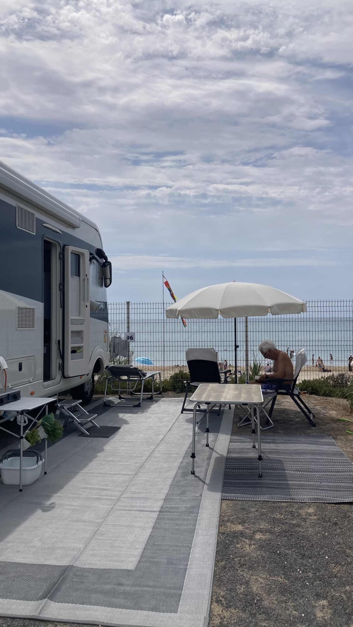 Um 15:30 Uhr checken wir auf Platz 96 ein. Strom anschliessen, Womo ausnivellieren, Sonnensegel, Teppich, Tisch, Stühle – alles sitzt.