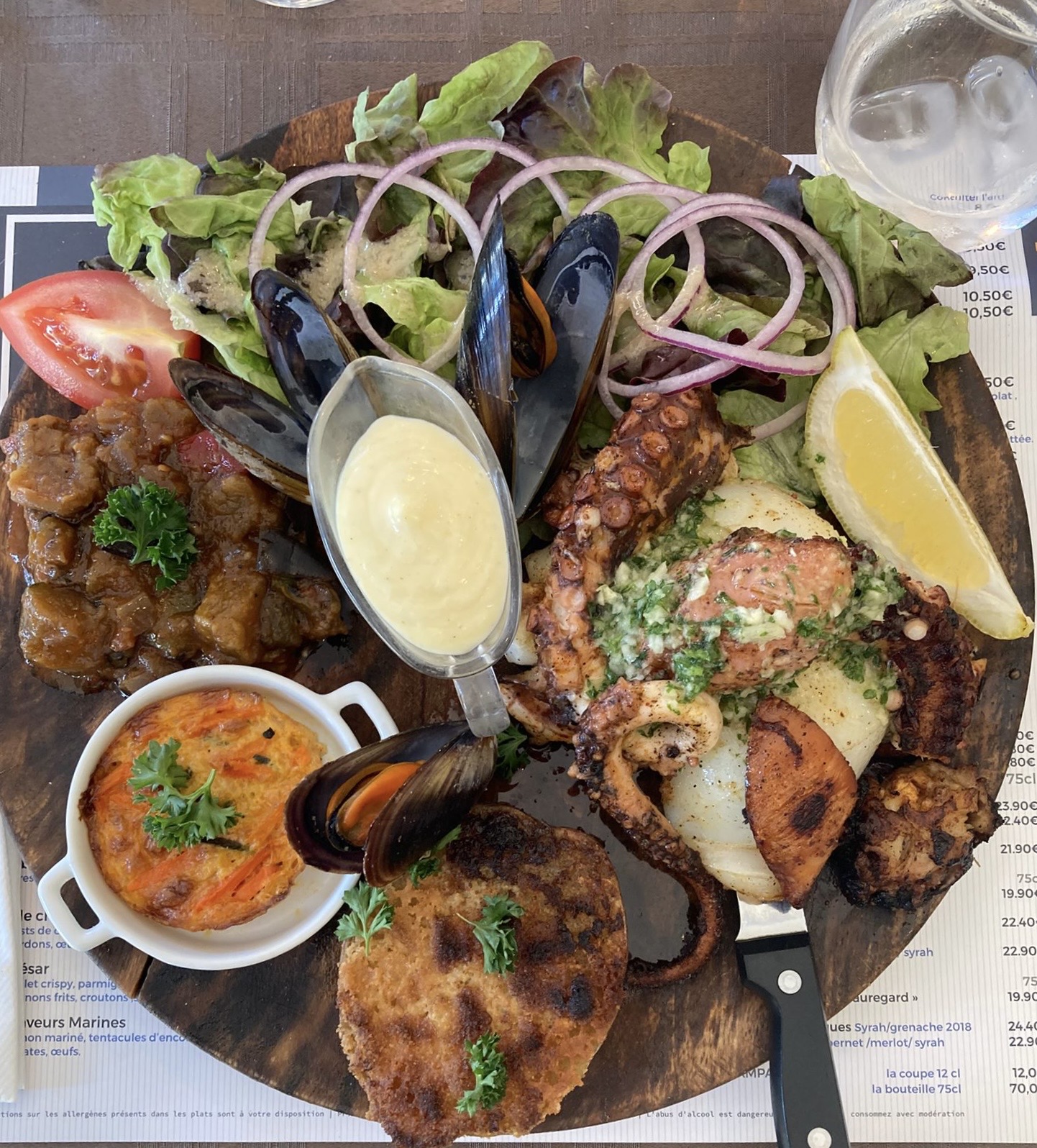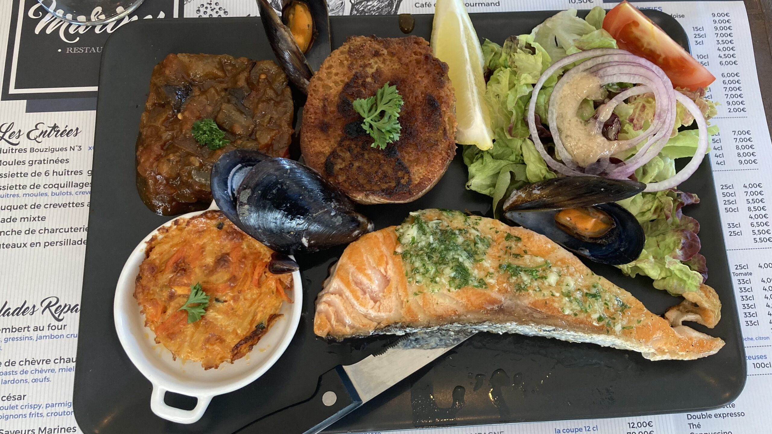 Am Abend essen wir im Les Saveurs Marines: Seiche, Pulpo und Lachs – ausgezeichnet!