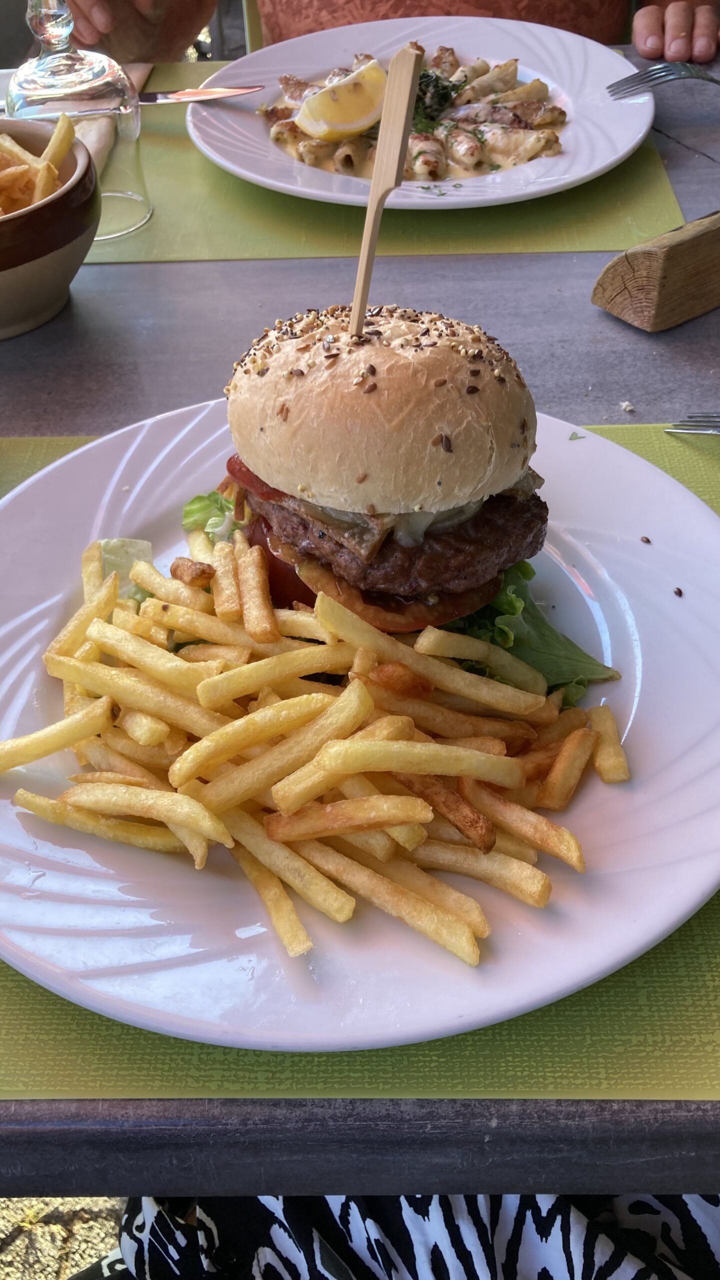 Abends essen wir im Campingrestaurant: Burger, Filets de Perche und als Dessert einen Colonel. Danach gehen wir früh schlafen.
