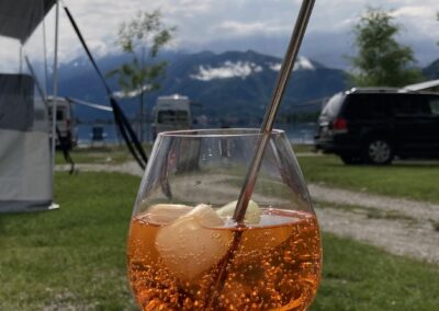 Apéro im Womo, Nachtessen im Campingrestaurent, Bruschetta, Penne arrabiata und Spaghetti mit Meeresfrüchten, dazu eine Flasche Montepulciano.
