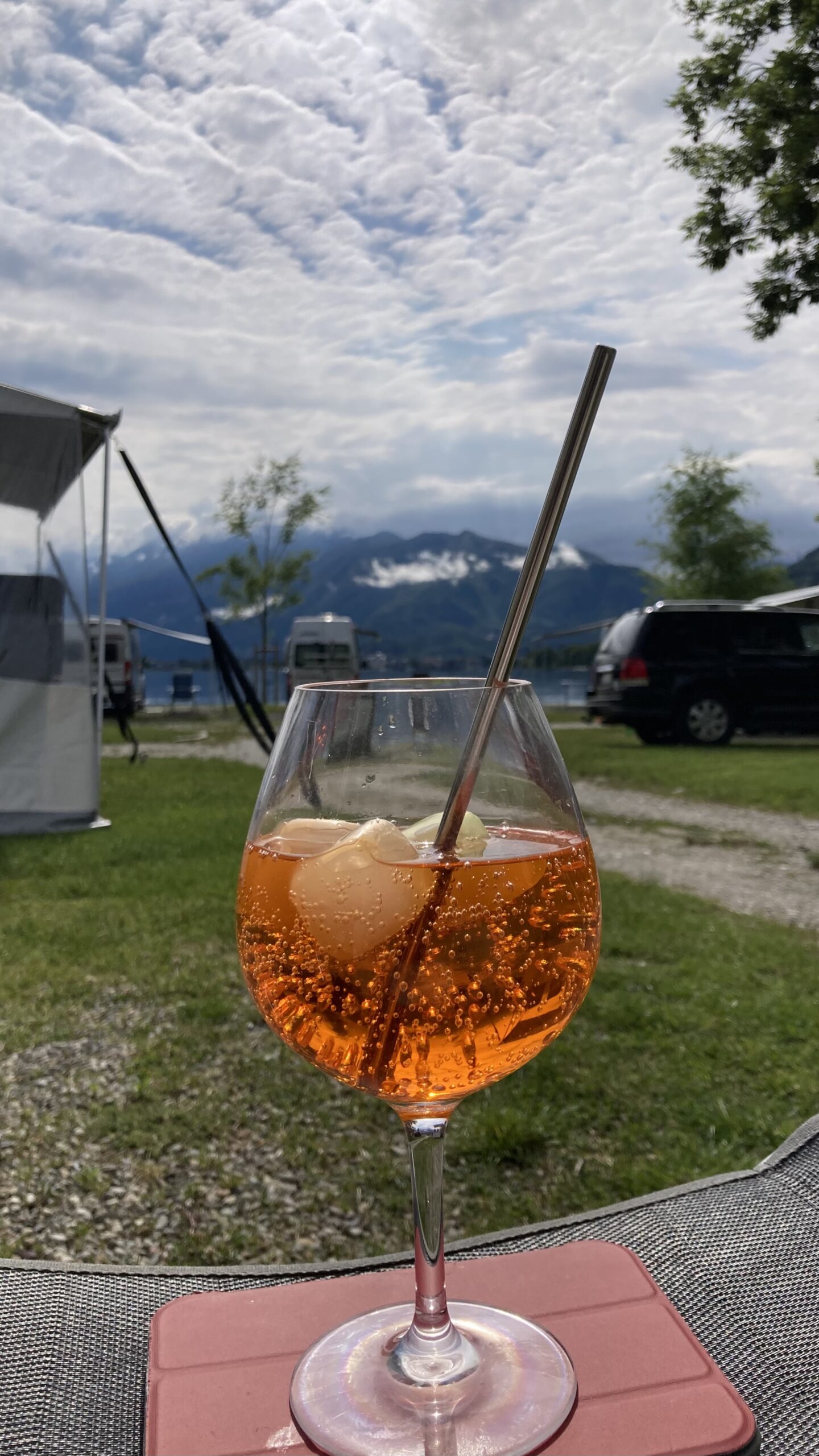 Apéro im Womo, Nachtessen im Campingrestaurent, Bruschetta, Penne arrabiata und Spaghetti mit Meeresfrüchten, dazu eine Flasche Montepulciano.